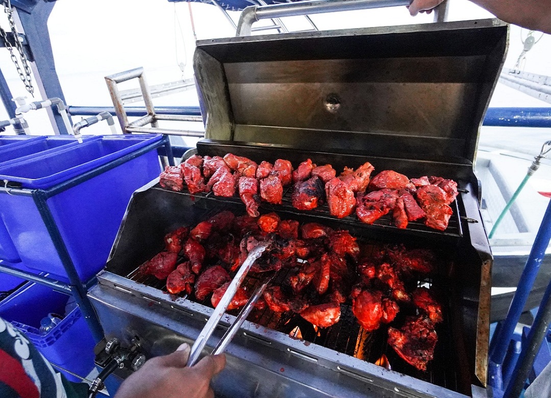 Nous disposons de deux cannes à traîne, que nous traînons derrière le bateau à chaque fois que nous passons d'une vague à l'autre.