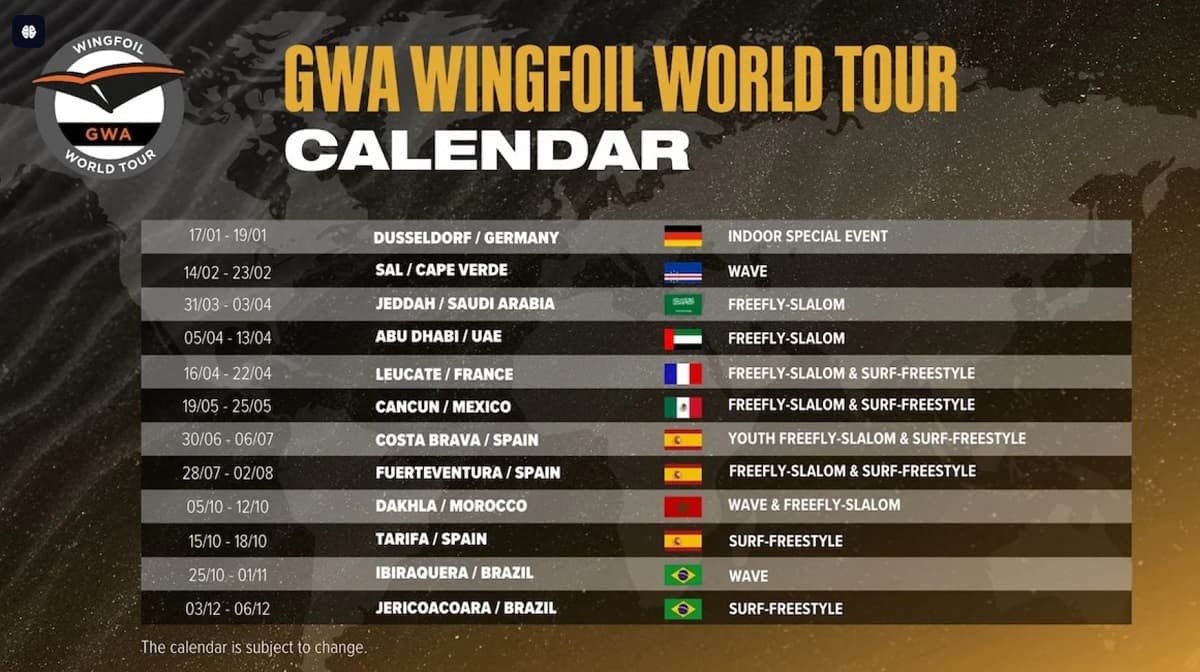 Du 5 au 12 octobre 2025, Dakhla accueillera également la GWA Wingfoil World Cup, une compétition de la discipline "Wave" avec une dotation de 10 000 euros. Cet événement fait partie d'un calendrier élargi pour la saison 2025, qui comprend 11 événements sur cinq continents, avec de nouvelles destinations comme Cancun, au Mexique, et Dakhla, rejoignant des étapes établies telles que le Mondial du Vent à Leucate, en France.