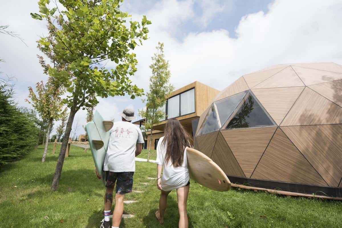 À Surf camp de Bilbao, nous avons un spa, de grandes terrasses, des espaces de détente, un espace hamac, un bar de surf avec un restaurant spécialisé dans l'alimentation saine, un grand jardin, des rampes pour le skateboard, un dôme polyvalent, un espace yoga et un sous-sol garage pour les clients. Nous disposons également de 11 chambres doubles, 6 chambres familiales et 6 pour groupes. Toutes avec salle de bain privée.