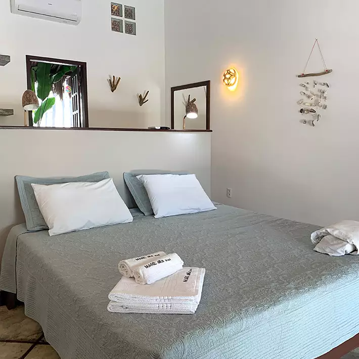 Les chambres enchanteresses de la « Pousada Maré Alta » se trouvent directement à la station et sont nichées dans une oasis de jardin tropical. Situées au rez-de-chaussée, elles disposent chacune d’une terrasse couverte avec coin salon confortable et hamac. Elles sont équipées d’un système de ventilation naturelle, climatisation, télévision, réfrigérateur et bouilloire. Chaque chambre possède une salle de bain ouverte unique, avec eau chaude, serviettes et savon fournis.