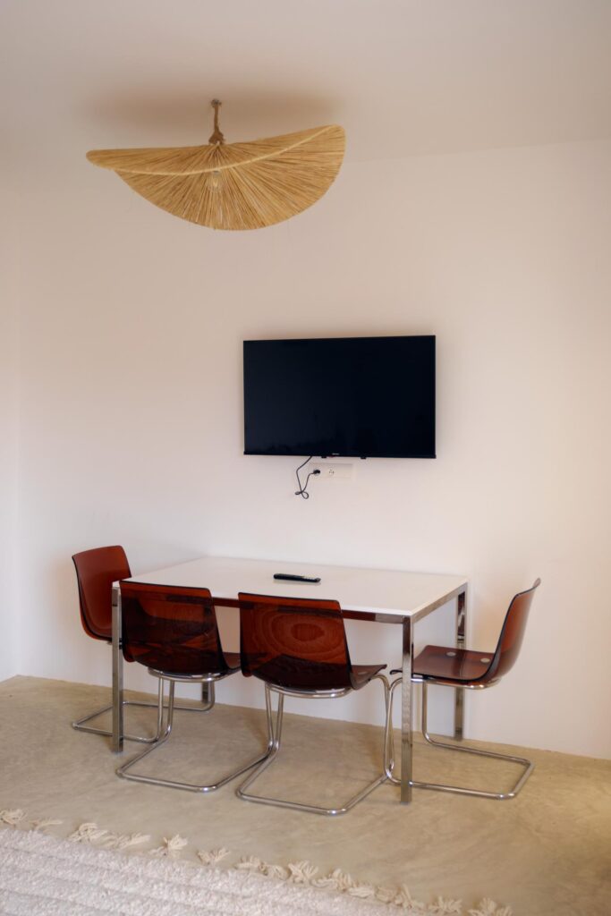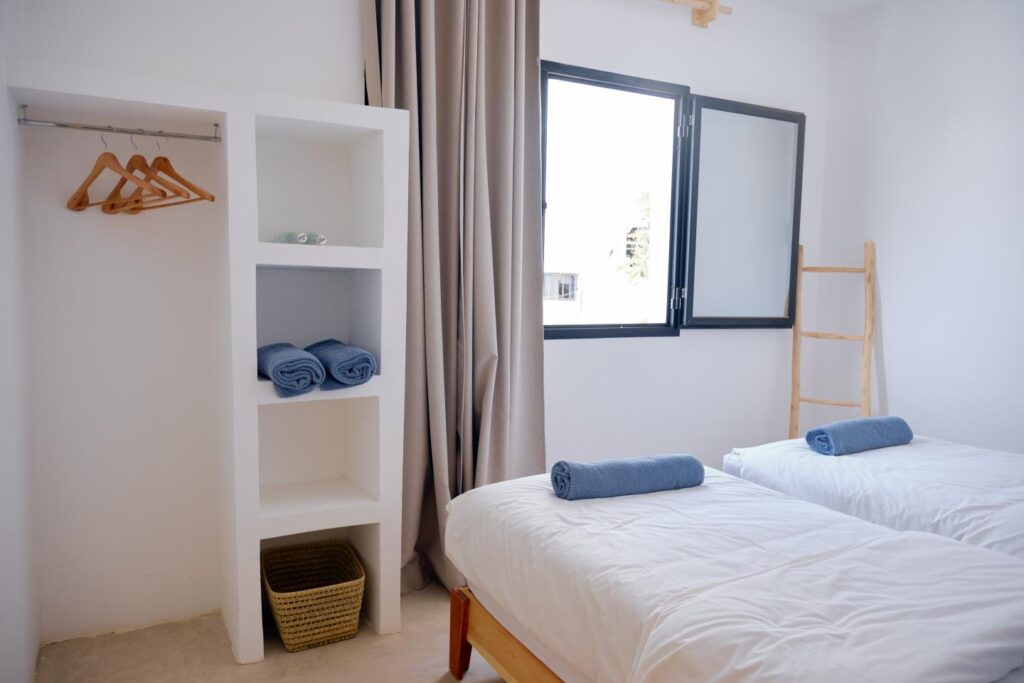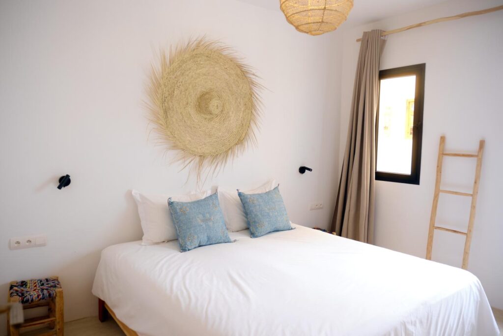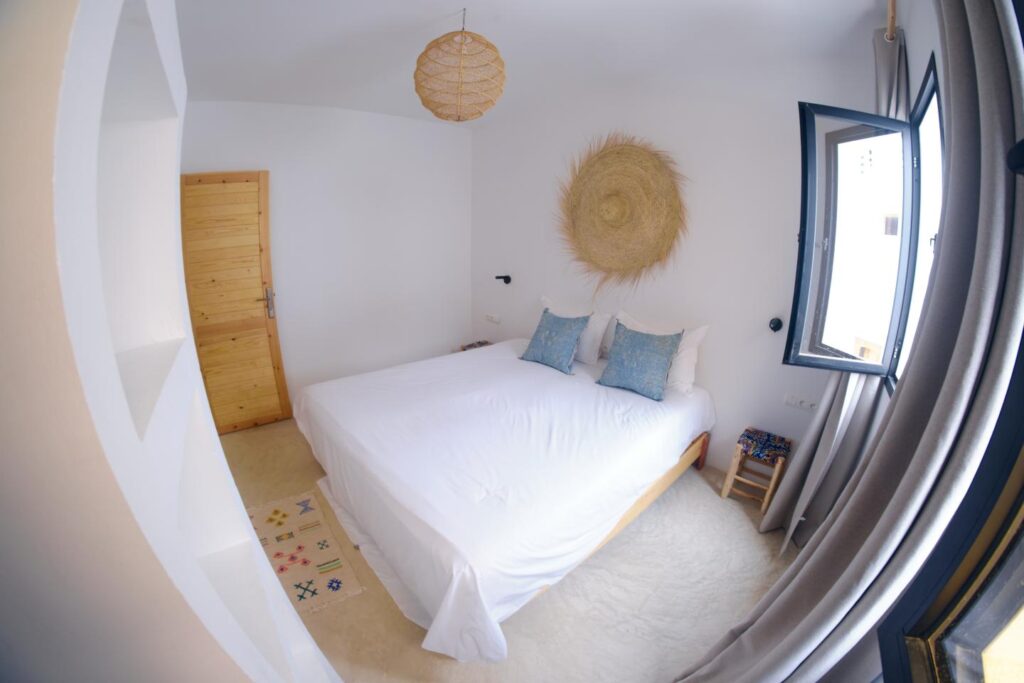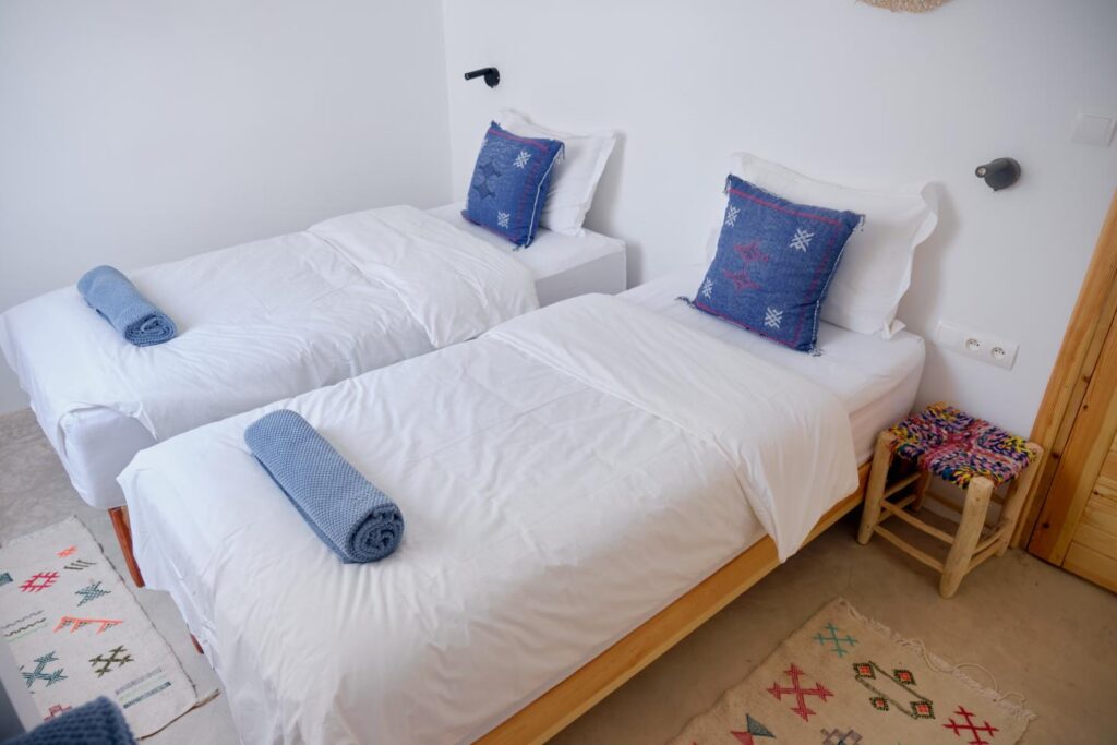Dans le surf lodge de taghazout, les chambres sont confortables, joliment décorées offrant toutes une salle de bain privée et certaines, une terrasse avec une vue imprenable sur les spots de la baie. Dans certaines doubles, il est possible d’ajouter un lit d’appoint pour un enfant.