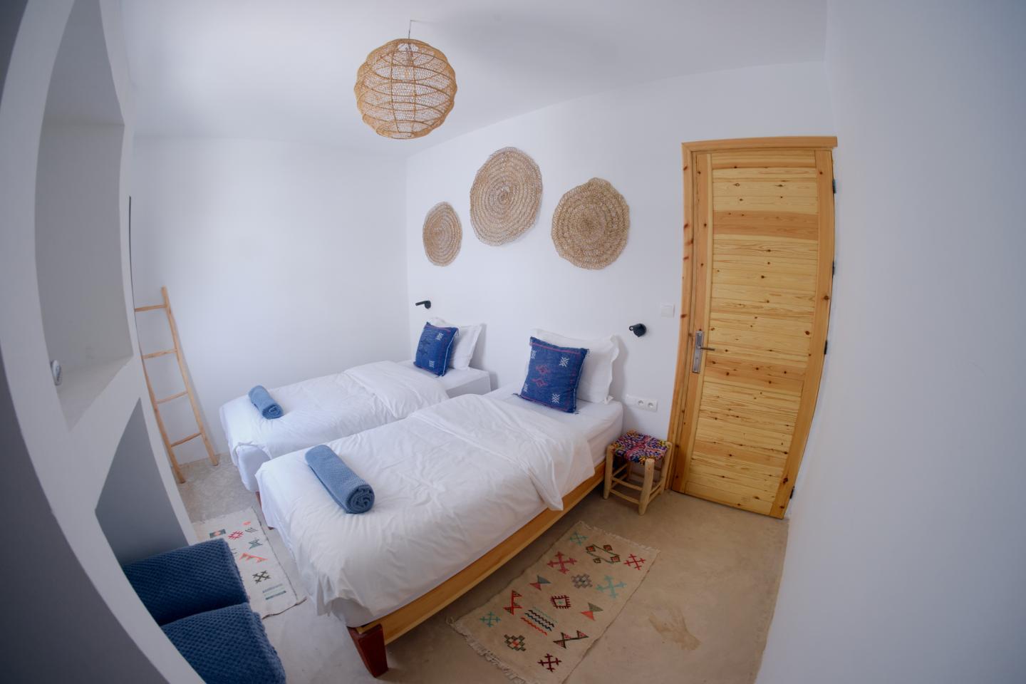 Dans le surf lodge de taghazout, les chambres sont confortables, joliment décorées offrant toutes une salle de bain privée et certaines, une terrasse avec une vue imprenable sur les spots de la baie. Dans certaines doubles, il est possible d’ajouter un lit d’appoint pour un enfant.