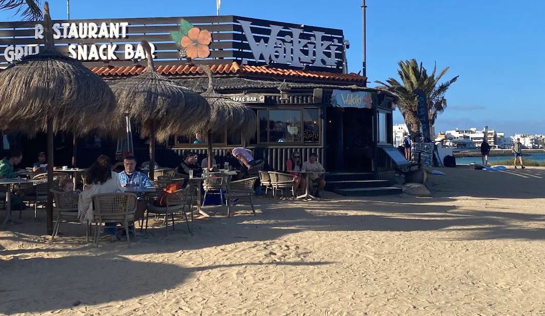 Situé directement sur la plage, Waikiki est l’un des lieux les plus emblématiques de Corralejo pour chiller la journée. L’ambiance est jeune, détendue, souvent rythmée par de la musique tropicale ou des sets légers. Les voyageurs s’y retrouvent pieds dans le sable autour de cocktails frais, de plats simples et de grandes tablées conviviales. C’est un spot idéal après une session surf ou pour profiter du soleil dans une ambiance animée mais jamais oppressante. Le service est rapide, le décor est lumineux et l’atmosphère reste 100 % bord de mer.