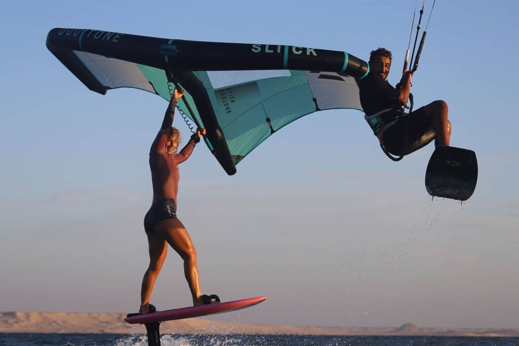 Si tu cherches le meilleur endroit pour commencer le wingfoil, ne cherche plus : Dakhla coche toutes les cases. Grâce à sa lagune protégée du vent et sans houle, les conditions y sont incroyablement stables, idéales pour faire ses premiers bords en toute confiance. L’eau y est plate, sans clapot, et les grandes zones peu profondes permettent de naviguer debout sans stress — parfait pour se concentrer sur sa technique sans craindre les vagues.